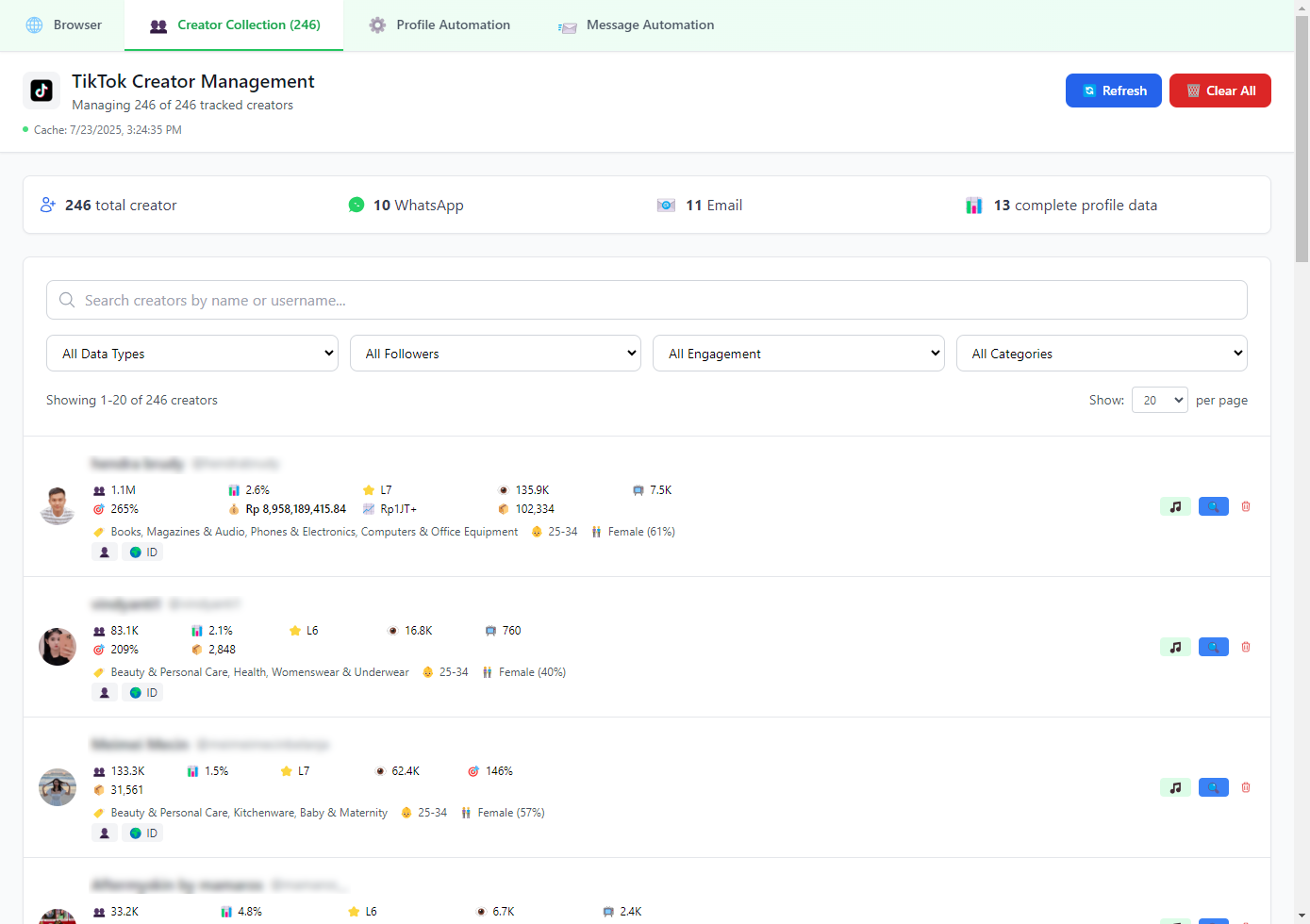 Temukan KOL yang tepat dalam hitungan detik. Cari influencer berdasarkan berbagai parameter penting seperti jumlah follower, estimasi GMV (Gross Merchandise Value), niche/kategori konten, dan platform mulai dari TikTok Shop, Shopee Affiliate, hingga creator khusus di bidang tertentu. Fitur ini dirancang agar kamu bisa menyaring ribuan profil secara cepat dan tepat sasaran. Mau cari KOL dengan performa tinggi di kategori “kecantikan,” “fashion,” atau “tech”? Bisa. Mau cari yang baru naik daun tapi punya engagement rate tinggi? Bisa juga. Cocok banget untuk brand, agency, atau seller yang butuh mitra promosi yang relevan, aktif, dan bisa langsung diajak kerja sama sesuai kebutuhan campaign.