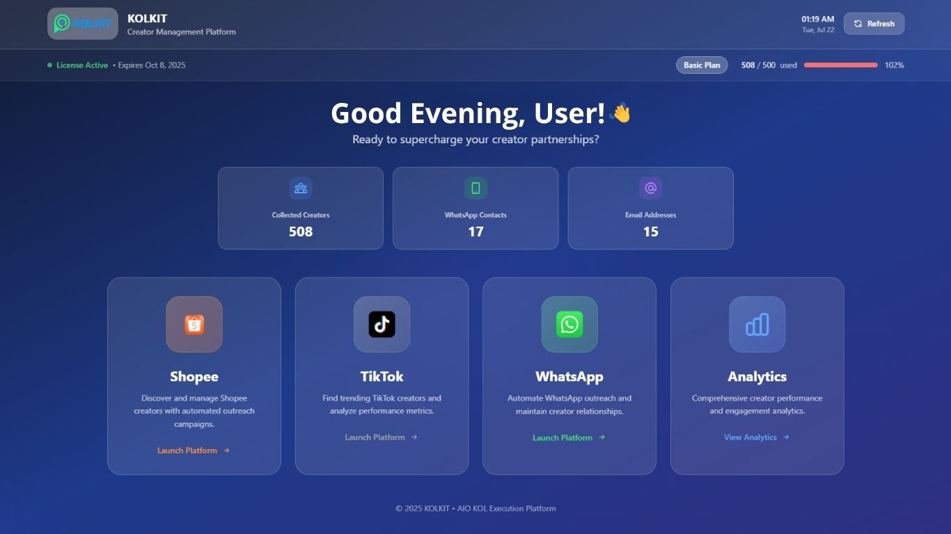 KOLKIT adalah platform otomatisasi outreach yang membantu brand dan seller menemukan, menghubungi, dan bekerja sama dengan kreator TikTok Shop, Shopee affiliator semua dalam satu tempat